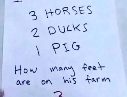 “If a farmer has 3 horses, 2 ducks, and 1 pig, how many feet are on his farm?”